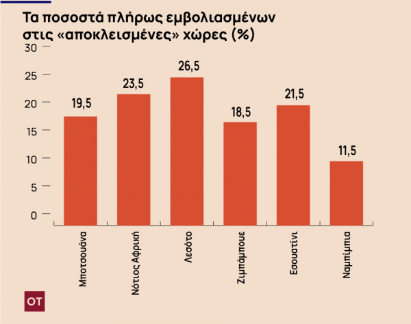 Για του λόγου το αληθές, το χαμηλότερο ανάμεσά τους καταγράφεται στην Ναμίμπια, με 11,5% πλήρως εμβολιασμένο, ενώ το υψηλότερο στο Λεσότο, με 26,5%.