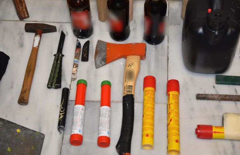• Αυτοσχέδιοι εμπρηστικοί μηχανισμοί (μολότοφ), μπιτόνια με βενζίνη και γυάλινες φιάλες, • Πλήθος ξύλινων και μεταλλικών επιμηκών αντικειμένων και σιδερόβεργες, • Μαχαίρια, τσεκούρι, σφυρί και φτυάρι, • Πυροτεχνικές κατασκευές, • Μεταλλικός τρίφτης κάνναβης με υπολείμματα στο εσωτερικό του και • Πλήθος ενδυμάτων που φέρουν λογότυπα συνδέσμων οπαδών άλλων αθλητικών σωματείων.