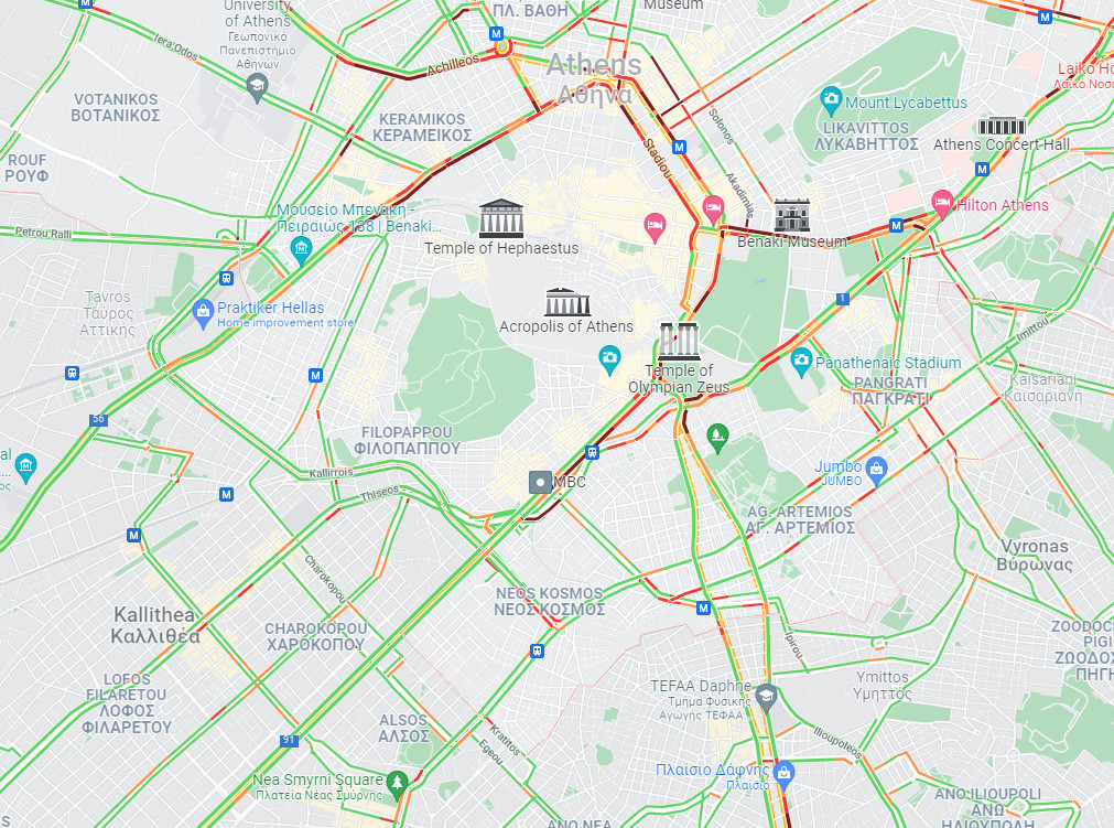 Συγκεκριμένα, τα αυτοκίνητα κινούνται με πολύ χαμηλές ταχύτητες στην άνοδο της Πειραιώς, στη Σταδίου, στην άνοδο της λεωφόρου Συγγρού από το ύψος της Καλλιρόης έως και τον Άγνωστο Στρατιώτη, η άνοδος της Καλλιρόης μέχρι τη διασταύρωση με την Πετμεζά.