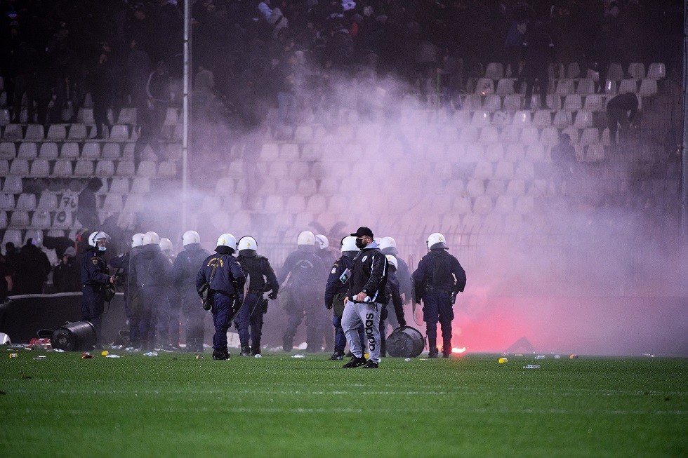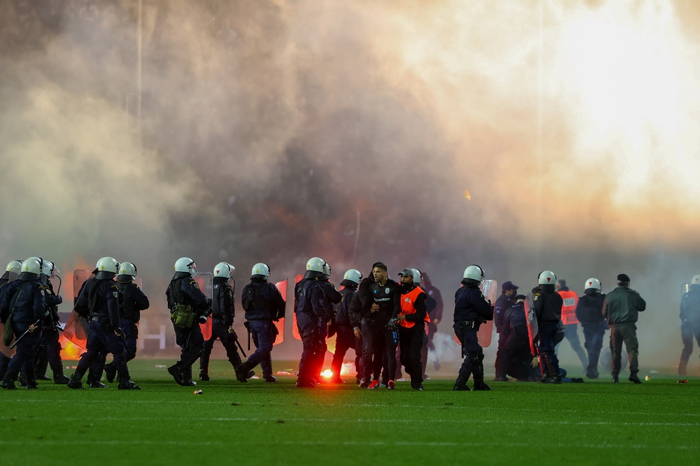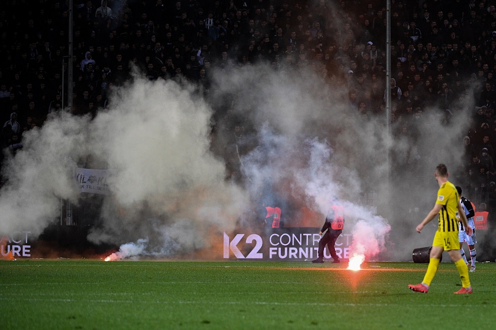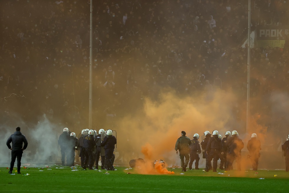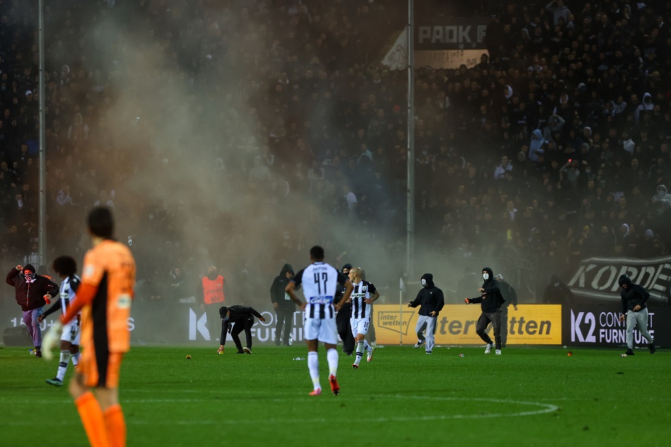 Από τα μέσα του δευτέρου μέρους είχαν αρχίσει οι οπαδοί του ΠΑΟΚ να πετούν φωτοβολίδες και αντικείμενα στον αγωνιστικό χώρο, με την κατάσταση να ξεφεύγει στα τελευταία λεπτά, με τον Σκωτσέζο διαιτητή, Μάντεν, να διακόπτει το παιχνίδι.