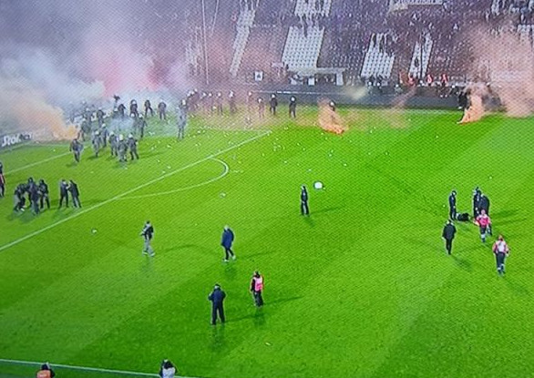 Μόλις μπήκαν μέσα τα ΜΑΤ για να επιβάλλουν την τάξη, οι οπαδοί του ΠΑΟΚ ήρθαν σε σύγκρουση μαζί τους με την κατάσταση να ξεφεύγει τελείως. Πλέον μένει να δούμε ποια θα είναι η τύχη του ματς και αν θα υπάρξει οριστική διακοπή. Το γήπεδο πάντως έχει αδειάσει, με τους οπαδούς των «ασπρόμαυρων» να έχουν αποχωρήσει από τις κερκίδες.