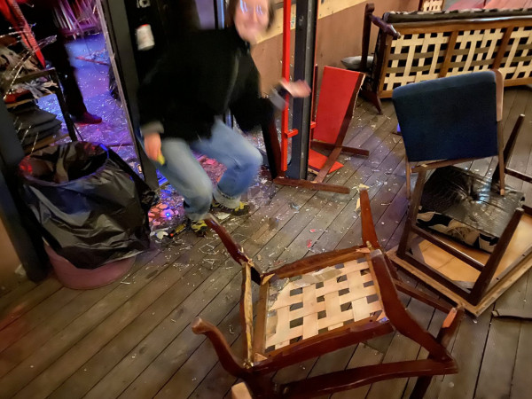 Οι δράστες έσπασαν τα παράθυρα του μαγαζιού και κατέστρεψαν τα υπαίθρια καθίσματα ενώ σύμφωνα με τοπικά μέσα, πολλοί από αυτούς ήταν οπλισμένοι με τηλεσκοπικά ρόπαλα και σπρέι πιπεριού.