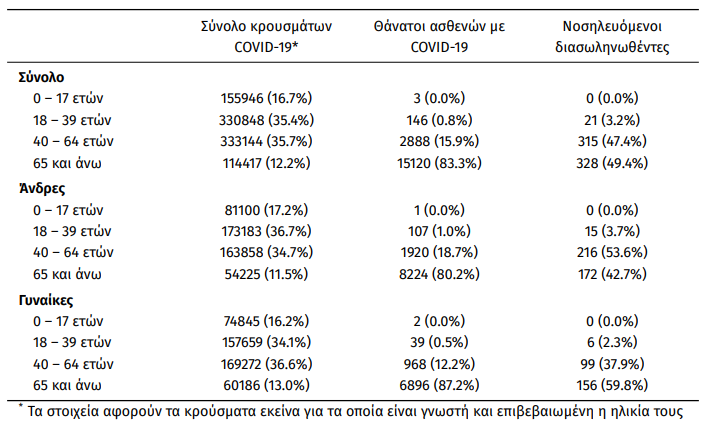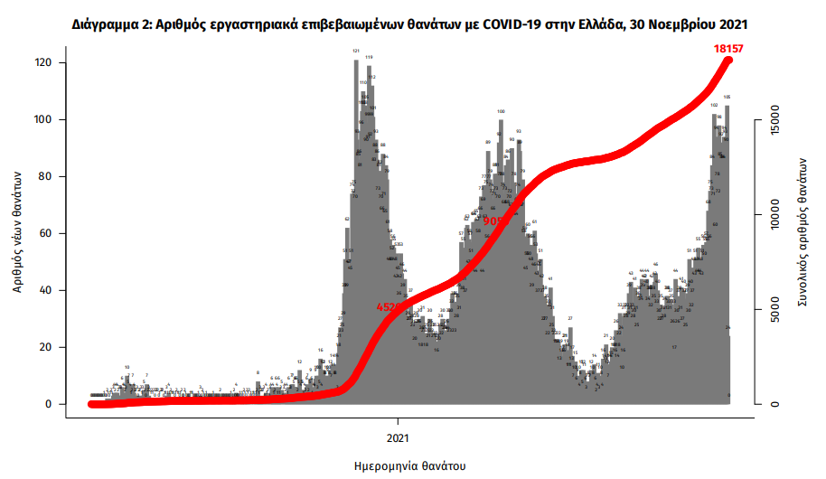 Οι νέοι θάνατοι ασθενών με COVID-19 είναι 88, ενώ από την έναρξη της επιδημίας έχουν καταγραφεί συνολικά 18.157 θάνατοι. Το 95.4% είχε υποκείμενο νόσημα ή/και ηλικία 70 ετών και άνω.