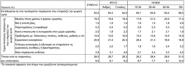 Συγκεκριμένα, οι παράγοντες που επηρεάζουν την ψυχική υγεία των εργαζομένων είναι κυρίως η εργασιακή ανασφάλεια σε ποσοστό 20,9 % και το φόρτο εργασίας σε ποσοστό 19,3%.