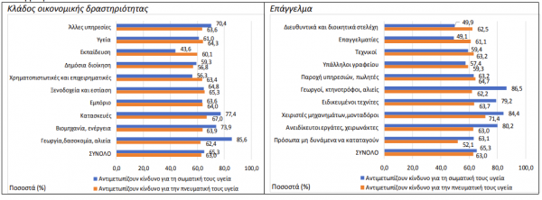 Οι κλάδοι με τη μεγαλύτερη έκθεση σε παράγοντες κινδύνου για την ψυχική υγεία είναι: -οι κατασκευές (67,0%), -τα ξενοδοχεία και εστίαση (65,3%) -η υγεία (64,3%).