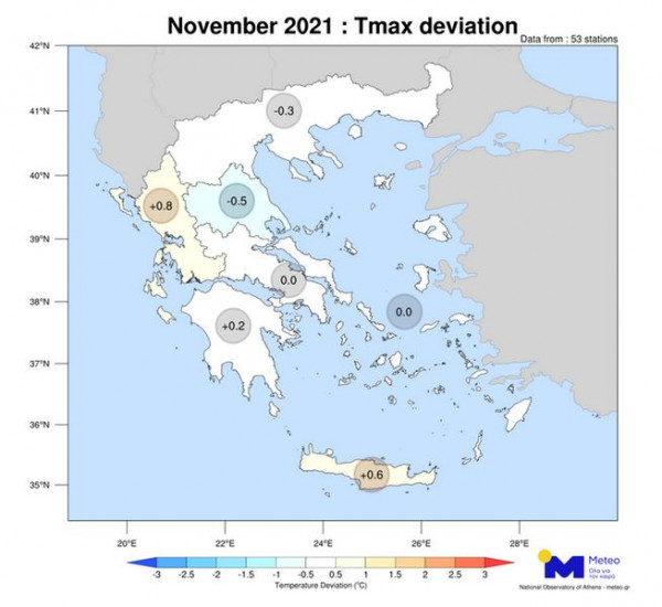 Ο παρακάτω χάρτης δείχνει τις τιμές των αποκλίσεων της μέγιστης θερμοκρασίας τον Νοέμβριο 2021 σε σχέση με τη μέση τιμή της περιόδου 2010-2019.