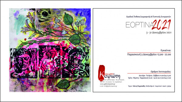 Η έκθεση «Εορτινά» που πραγματοποιείται στην γκαλερί εδώ και είκοσι χρόνια, λίγο πριν τις γιορτές, είναι ένα μικρό πανόραμα των νέων τάσεων της σύγχρονης εικαστικής δημιουργίας με αναφορές από τον Ρεαλισμό, τον Υπερρεαλισμό έως την αφαίρεση.