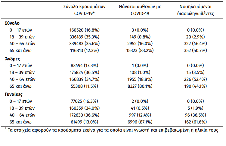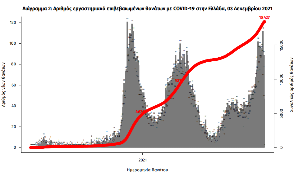Οι νέοι θάνατοι ασθενών με COVID-19 είναι 97, ενώ από την έναρξη της επιδημίας έχουν καταγραφεί συνολικά 18.427 θάνατοι. Το 95.4% είχε υποκείμενο νόσημα ή/και ηλικία 70 ετών και άνω.