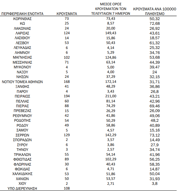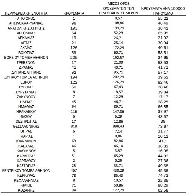Την ίδια στιγμή, εκτός της Θεσσαλονίκης, μόλις έξι περιοχές καταγράφουν τριψήφιο αριθμό κρουσμάτων.