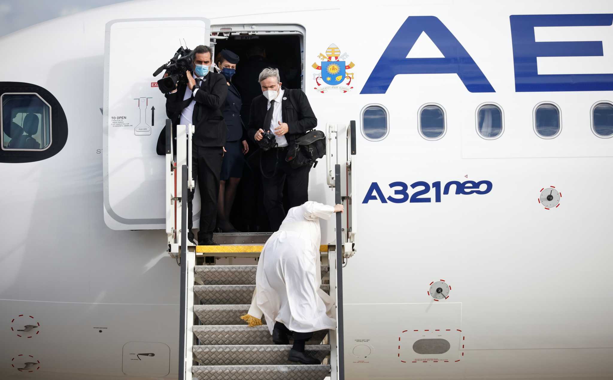 Συγκεκριμένα, την ώρα που ανέβαινε τα σκαλιά του αεροπλάνου για την αναχώρησή του ο Πάπας σκόνταψε λόγω των ισχυρών ανέμων.