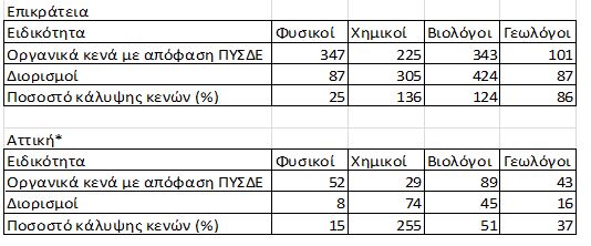Από τα ποσοστά των πινάκων είναι φανερό ότι η κάλυψη οργανικών κενών (δηλαδή των θέσεων που υπάρχει ανάγκη για μόνιμο διορισμό), με βάση τα στοιχεία που έστειλαν τα Περιφερειακά Υπηρεσιακά Συμβούλια Δευτεροβάθμιας Εκπαίδευσης (ΠΥΣΔΕ) στο Υπουργείο Παιδείας, είναι απολύτως ανεπαρκής για τους φυσικούς (25%), πολύ ικανοποιητική για τους γεωλόγους (87%), ενώ υπάρχει υπερκάλυψη (δηλαδή διορίστηκαν περισσότεροι από τις δηλωμένες από τα ΠΥΣΔΕ ανάγκες) σε χημικούς (136%) και βιολόγους (124%).