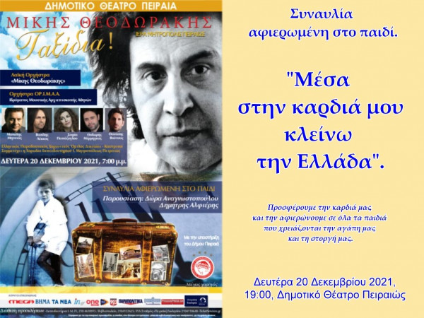 H Ι.Μητρόπολη Πειραιώς θέλοντας να στηρίξει ενεργά και ουσιαστικά τα παιδιά, τις πολύτεκνες οικογένειες και την ελπιδοφόρα νεότητα που αποτελεί το μέλλον της πατρίδος μας, διοργανώνει την Δευτέρα 20 Δεκεμβρίου στις 19:00 στο Δημοτικό Θέατρο Πειραιώς, μεγάλη Συναυλία αφιερωμένη στο παιδί με γενικό σύνθημα «Μέσα στην καρδιά μου κλείνω την Ελλάδα».