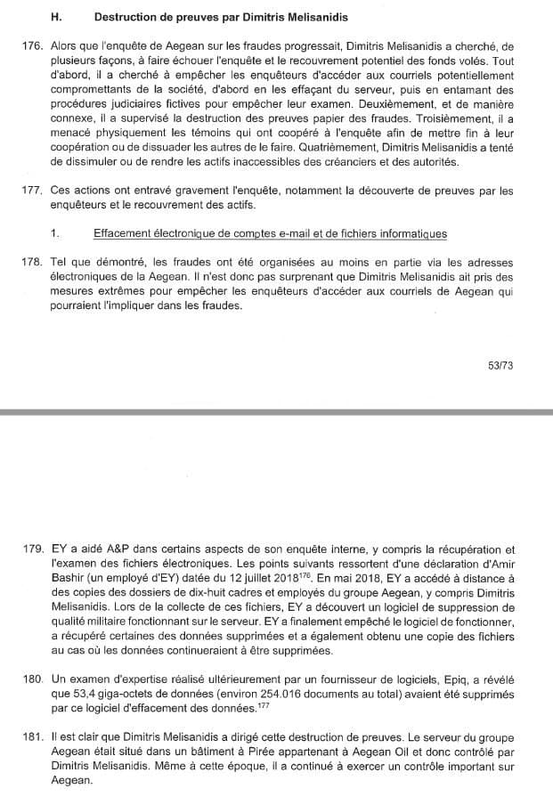 Η αγωγή υπογραμμίζει ότι «ο διακομιστής του ομίλου Aegean βρισκόταν σε ένα κτίριο στον Πειραιά που ανήκε στην Aegean Oil και, επομένως, ελεγχόταν από τον Δημήτρη Μελισσανίδη».