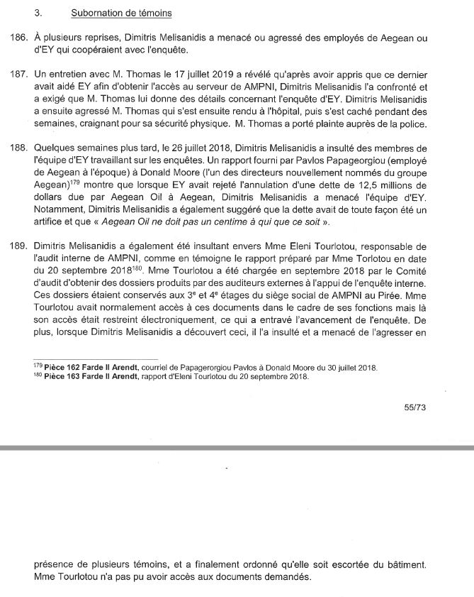 Η αγωγή υποστηρίζει ότι «ο Δημήτρης Μελισσανίδης απείλησε ή επιτέθηκε σε υπαλλήλους του ομίλου Aegean ή της EY που συνεργάζονταν με την έρευνα». Παραθέτουμε τα όσα αναφέρει η αγωγή επ’ αυτού του θέματος.