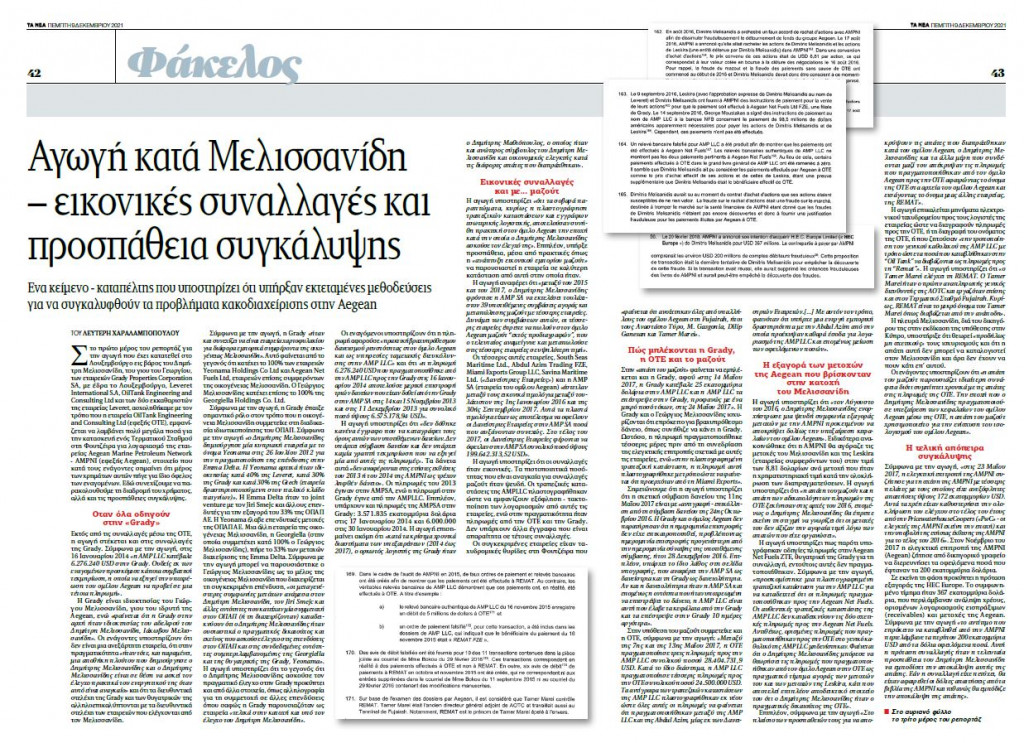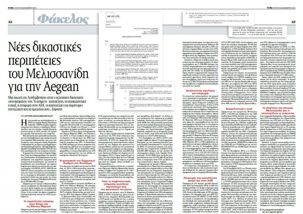 Στα δύο προηγούμενα ρεπορτάζ ασχοληθήκαμε εκτενώς με την αγωγή που έχει κατατεθεί στο Λουξεμβούργο εις βάρος του Δημήτρη Μελισσανίδη, του γιού του Γεωργίου, των εταιρειών Grady Properties Corporation SA, με έδρα το Λουξεμβούργο, Leveret International S.A, Oil Tank Engineering and Consulting Ltd (OTE) και των δύο εκκαθαριστών της εταιρείας Leveret, αγωγή που έχει κατατεθεί από το Aegean Litigation Trust και έχει να κάνει με τα ζητήματα κακοδιαχείρισης στην εταιρεία Aegean Marine Petroleum Network – ΑMPNI (εφεξής Aegean).