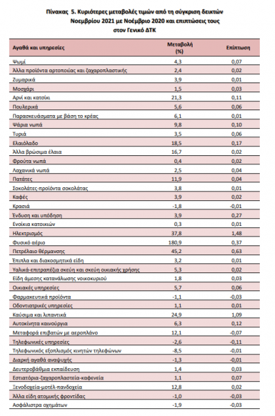 Η αύξηση του Γενικού ΔΤΚ κατά 4,8% τον μήνα Νοέμβριο 2021, σε σύγκριση με τον αντίστοιχο Δείκτη του Νοεμβρίου 2020, προήλθε κυρίως από τις μεταβολές στις ακόλουθες ομάδες αγαθών και υπηρεσιών:
