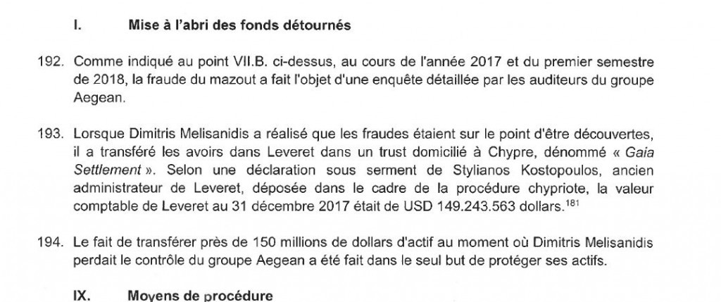 According to the lawsuit, “when Dimitris Melissanidis realized that the frauds were about to be uncovered, he transferred Leveret into a Cyprus-domiciled trust, referred to as the “Gaia Settlement.”According to an affidavit by Stylianos Kostopoulos, a former director of Leveret, filed in the Cyprus proceedings, Leveret’s “book value” as of 31 December 2017 was $149,243,563”.
