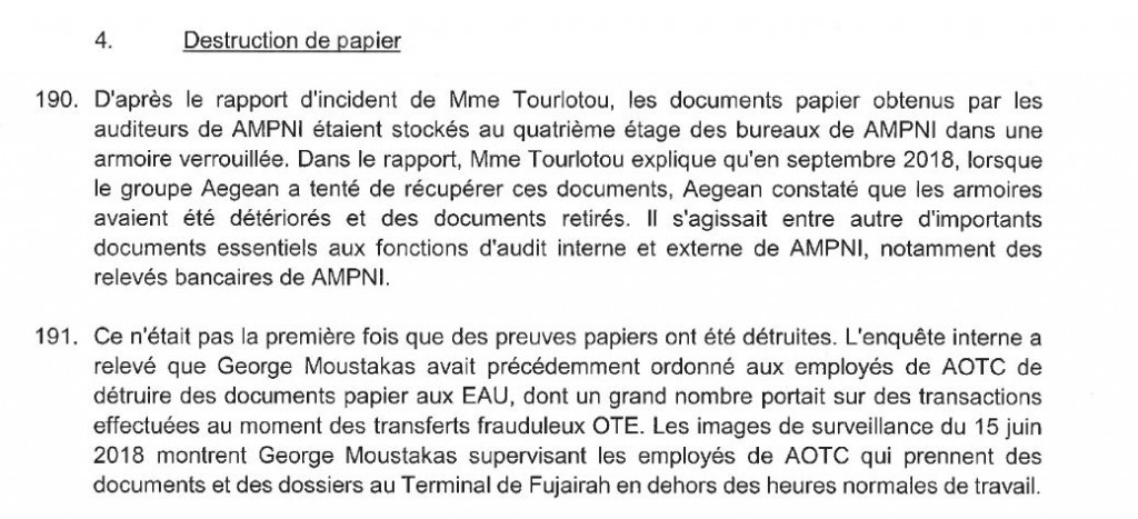 It is argued in the lawsuit that “these actions were not the first time hard-copy evidence was destroyed”. Tellingly, one reads that “the internal investigation discovered that Giorgios Moustakas previously instructed AOTC employees to destroy hard-copy documents in the U.A.E., many of which related to transactions occurring at the time of the fraudulent transfers to OTE. Video camera surveillance footage from 15 June 2018 shows Mr Moustakas supervising AOTC employees taking documents and files from the Fujairah Terminal outside normal business hours”.
