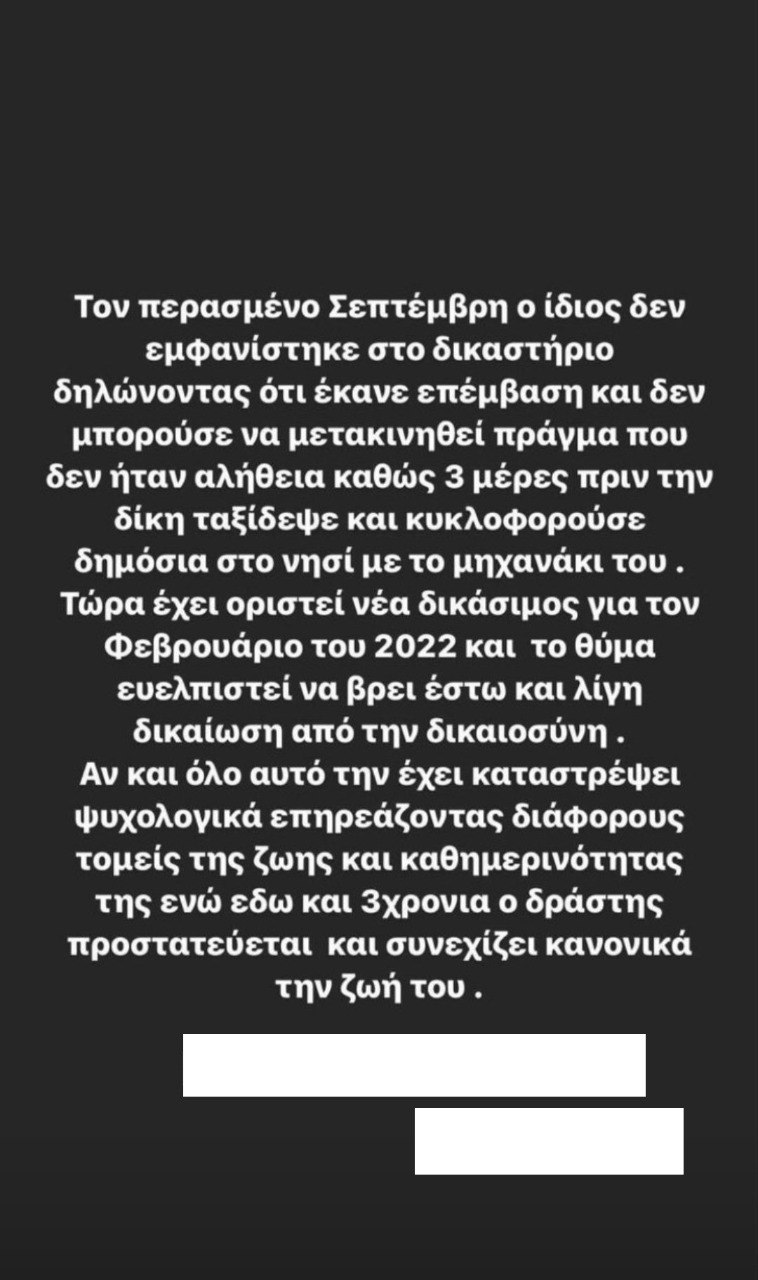 «Τον περασμένο Σεπτέμβρη ο ίδιος δεν εμφανίστηκε στο δικαστήριο, δηλώνοντας ότι έκανε επέμβαση και δεν μπορούσε να μετακινηθεί, πράγμα που δεν ήταν αλήθεια, καθώς τρεις μέρες πριν την δίκη ταξίδεψε» αναφέρεται στην ανάρτηση, η οποία καταλήγει πως έχει οριστεί νέα δικάσιμος για Φεβρουάριο του 2022.