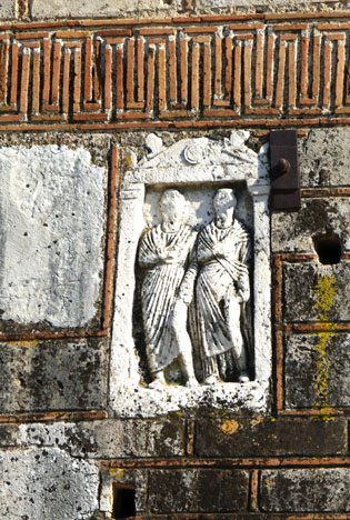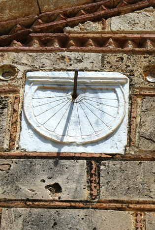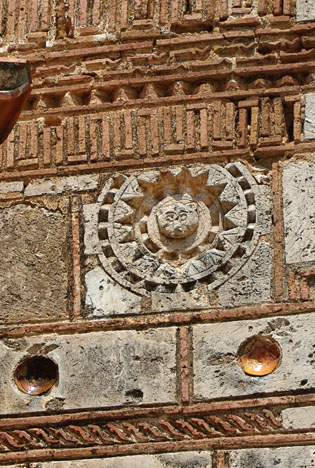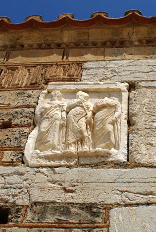 Ποικιλία κεραμοπλαστικών κοσμεί τις όψεις του ναού, στην τοιχοποιία του οποίου είναι ενσωματωμένο αρχαίο υλικό, καθώς και ένα ηλιακό ρολόι.