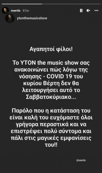 «Αγαπητοί φίλοι, το YTON the music show σας ανακοινώνει πως λόγω της νόσησης COVID-19 του κυρίου Βέρτη δε θα λειτουργήσει αυτό το Σαββατοκύριακο. Παρόλο που η κατάσταση του είναι καλή, του ευχόμαστε όλοι γρήγορα περαστικά και να επιστρέψει πολύ σύντομα και πάλι στις μαγικές εμφανίσεις του».