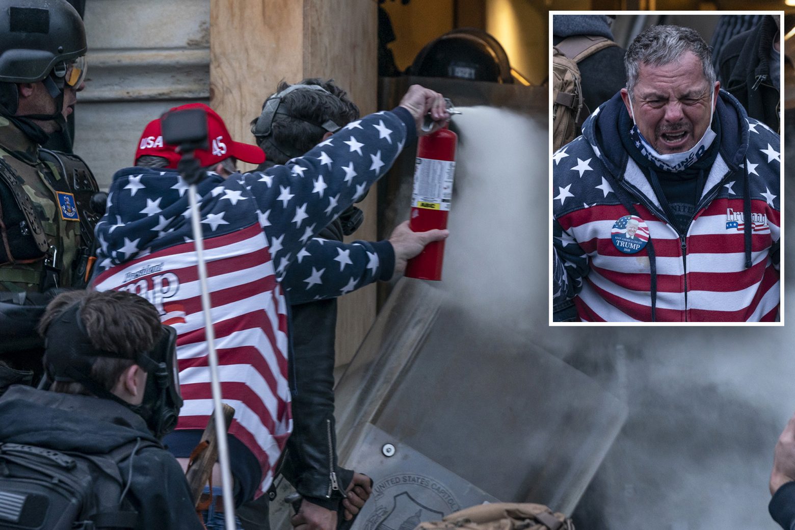 Ο Ρόμπερτ Σκοτ Πάλμερ, 54 ετών, φορώντας τζάκετ στα χρώματα της αμερικανικής σημαίας και κασκέτο με το σύνθημα «Η Φλόριντα υπέρ του Τραμπ», θεάθηκε να εκτοξεύει ξύλα, πυροσβεστήρα και άλλα αντικείμενα εναντίον αστυνομικών, κοντά στο Καπιτώλιο (φωτογραφίες και βίντεο, κάτω).
