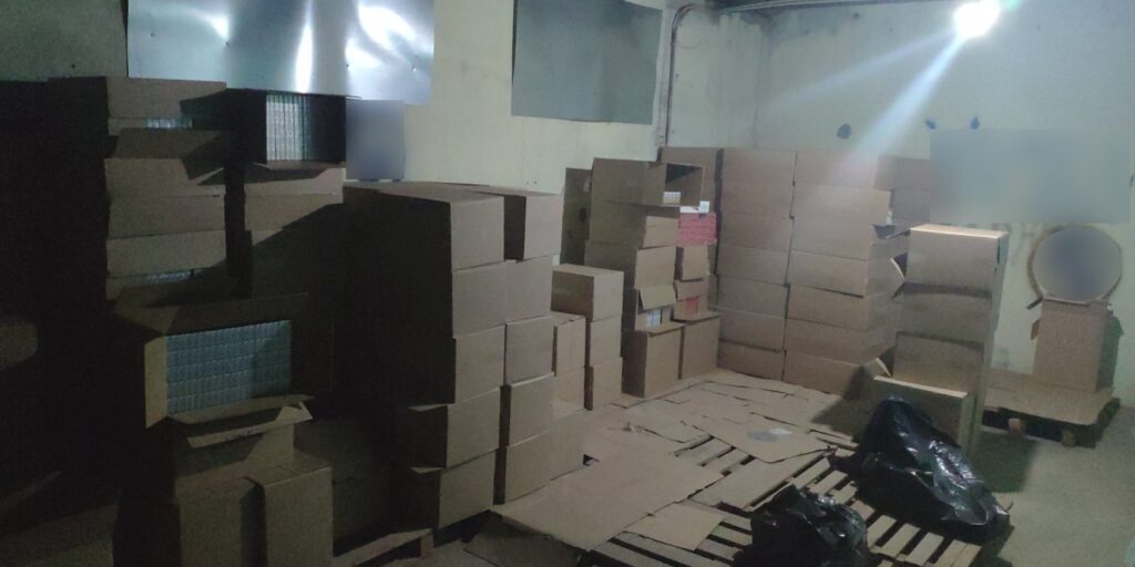 Ειδικότερα, μετά από συντονισμένες ενέργειες των αστυνομικών, εντοπίστηκε ο προαναφερόμενος άνδρας και σε έρευνα που πραγματοποιήθηκε σε αποθηκευτικό χώρο που χρησιμοποιούσε, βρέθηκαν και κατασχέθηκαν: • 71.360 πακέτα τσιγάρων (δηλαδή 1.427.200 τεμάχια τσιγάρων) και • 2.240 συσκευασίες καπνού των 50 γραμμαρίων η καθεμία, συνολικού βάρους 112 κιλών, τα οποία δεν έφεραν την ειδική ταινία φόρου κατανάλωσης και δεν είχαν καταβληθεί οι νόμιμοι φόροι και δασμοί.