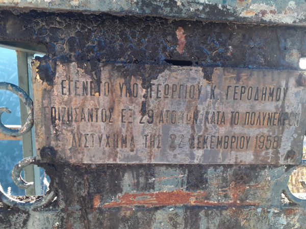 «Για να θυμόμαστε αυτούς που σκοτώθηκαν στις 22-12-1958. Εδώ έπεσε το λεωφορείο με 29 νεκρούς» γράφει η μαρμάρινη πλάκα.