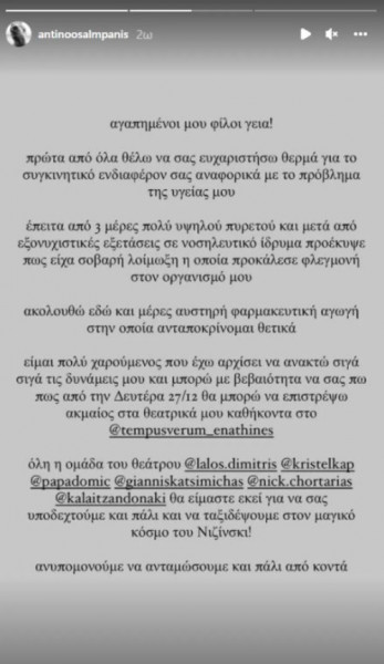 Ακολουθώ εδώ και μέρες αυστηρή φαρμακευτική αγωγή, στην οποία ανταποκρίνομαι θετικά. Είμαι πολύ χαρούμενος που έχω αρχίσει να ανακτώ σιγά-σιγά τις δυνάμεις μου και μπορώ με βεβαιότητα να σας πω πως από τη Δευτέρα 27/12 θα μπορώ να επιστρέψω ακμαίος στα θεατρικά μου καθήκοντα στο @tempusverum_enathines. Όλη η ομάδα του θέατρου @lalos.dimitris @kristelkap @papadomic @gianniskatsimichas @nick.chortarias @kalaitzandonaki θα είμαστε εκεί για να σας υποδεχτούμε και πάλι και να ταξιδέψουμε στον μαγικό κόσμο του Νιζίνσκι. Ανυπομονούμε να ανταμώσουμε και πάλι από κοντά».