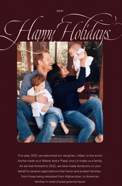 «Φέτος, το 2021, καλωσορίσαμε την κόρη μας, Λίλιμπετ, στον κόσμο. Ο Άρτσι μας έκανε “μαμά” και “μπαμπά” και η Λίλι μας έκανε οικογένεια», γράφουν ο Χάρι και η Μέγκαν στην κάρτα τους.