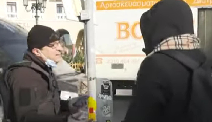 Η κάμερα «τσάκωσε» τον αστυνομικό να τιμωρεί τον πολίτη που δεν φορούσε μάσκα. Ωστόσο, ούτε ο ίδιος -όπως φαίνεται και στο βίντεο- φορούσε αφού είχε τη δική του στο πιγούνι.
