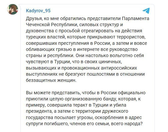 Ο Καντίροφ έδειξε την αντίδρασή του στα social media, γράφει η τουρκική εφημερίδα, παραθέτοντας την ανάρτηση του ηγέτη της Τσετσενίας στο Telegram
