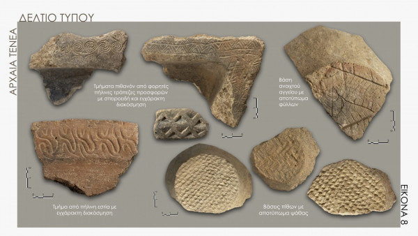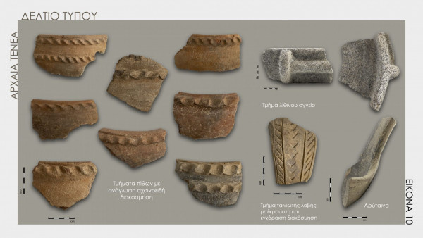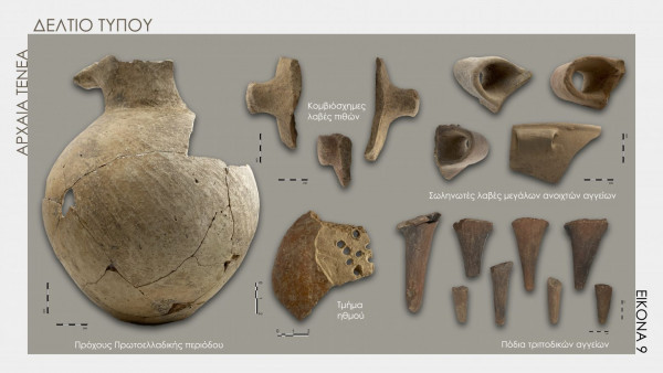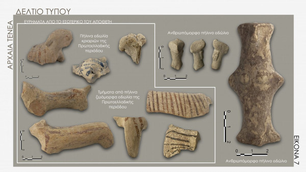 Τα ευρήματα από το στρώμα επικάλυψης αλλά και το εσωτερικό του αποθέτη είναι ιδιαίτερα σημαντικά. Από αυτά ξεχωρίζουν ειδώλια κριαριών (Εικ.7), βάσεις αποθηκευτικών αγγείων με αποτύπωμα ψάθας και μία βάση με αποτύπωμα φύλλων (Εικ.8), τμήματα από πήλινες εστίες με εγχάρακτη διακόσμηση (Εικ.8), τμήματα πιθανόν από φορητές πήλινες τράπεζες προσφορών με σπειροειδή και εγχάρακτη διακόσμηση (Εικ.8), πόδια τριποδικών αγγείων και κρατευτών, πρόχοι (Εικ.9), πολυάριθμα θραύσματα ανοιχτών αγγείων, φιάλες με μαύρο και ερυθρό επίχρισμα, φιάλες με πόδι και φιάλες με δακτυλιόσχημη ή επίπεδη βάση, κομβιόσχημες λαβές από πίθους, καθώς και σωληνωτές από μεγάλα ανοιχτά αγγεία (Εικ.9). Λαβές με έκκρουστη και εγχάρακτη διακόσμηση και τμήματα πίθων με ανάγλυφη σχοινοειδή διακόσμηση (Εικ.10). Επιπλέον, ήλθαν στο φως τμήματα από κύμβες (σαλτσιέρες), αρύταινες, πινάκια και τμήμα λίθινου σκεύους (Εικ.10). Σημαντικός είναι και ο εντοπισμός μεγάλης ποσότητας σφονδυλιών, καθώς και πυρήνων, λεπίδων και απολεπισμάτων από οψιανό, καθώς και λειασμένων εργαλείων (Εικ.11).