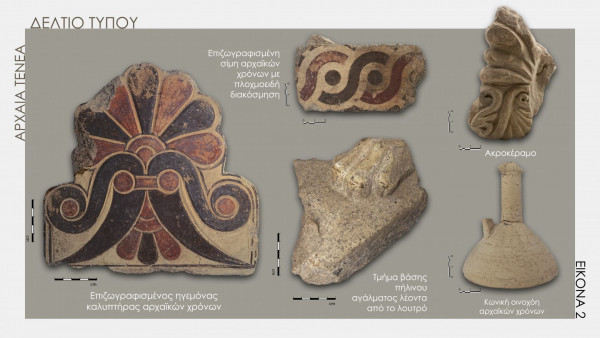 Εν συνεχεία, βόρεια των θερμών δωματίων ανασκάφηκε το τρίτο praefurnium των λουτρών και οι χώροι που εξυπηρετούσαν στην αποθήκευση υλικών-ξυλείας για τη λειτουργεία του. Εντός των τομών αυτών, μεταξύ άλλων ευρημάτων των ρωμαϊκών χρόνων, βρέθηκαν καταπεσμένα αρχιτεκτονικά μέλη αρχαϊκής περιόδου, ένας ηγεμόνας καλυπτήρας και μια επιζωγραφισμένη σίμη με πλοχμοειδή διακόσμηση (Εικ.2), στοιχεία που πιθανώς προέρχονται από κτίριο ίδιας χρονολογικής με αυτά περιόδου, το οποίο πιθανολογείται ότι βρίσκεται στην εγγύτητα του μνημείου και του οποίου έχουν εντοπιστεί σε προγενέστερες ανασκαφικές περιόδους σημαντικά αρχιτεκτονικά μέλη .