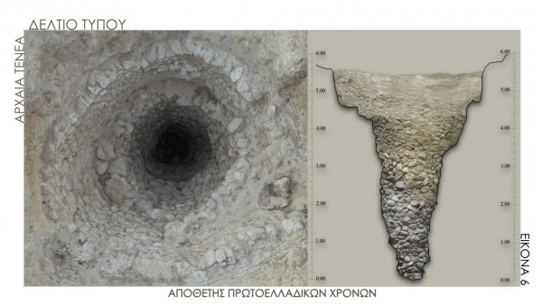 Η σπουδαιότερη ανακάλυψη της φετινής ανασκαφικής περιόδου, που προσθέτει νέα δεδομένα αναφορικά με την κατοίκηση στην περιοχή της Τενέας, είναι η ανασκαφή ενός κτιστού προϊστορικού (Πρώιμης Εποχής Χαλκού) αποθέτη. Εντοπίστηκε βόρεια του λουτρικού συγκροτήματος σε απόσταση 45μ. και σε βάθος περίπου 2μ. από την επιφάνεια του εδάφους. Έφερε επικάλυψη από στρώμα αργών λίθων και σωρεία κεραμικής πάχους περίπου 2μ. Τα εσωτερικά τοιχώματα της εν λόγω κατασκευής αποτελούνται από ομοιόμορφο και ιδιαίτερα επιμελημένο χτίσιμο από αργούς λίθους μεγάλου μεγέθους και στο ανώτερο τμήμα της διαμορφώνονται επάλληλα επίπεδα σπειροειδούς μορφής, που πιθανότατα εξυπηρετούσαν την κάθοδο και την άνοδο στο εσωτερικό της. Το σχήμα του αποθέτη είναι ελλειψοειδές με διαστάσεις αξόνων 3,30μ. × 3,10μ. και το βάθος του κάτω από το στρώμα επικάλυψης φτάνει στα 6.80μ. Ο αποθέτης στενεύει σταδιακά έως το τέρμα του, φτάνοντας να έχει τελικές διαστάσεις αξόνων 0.60μ. × 0,45μ. και εσωτερικό ύψος 4.80μ. (Εικ.6).
