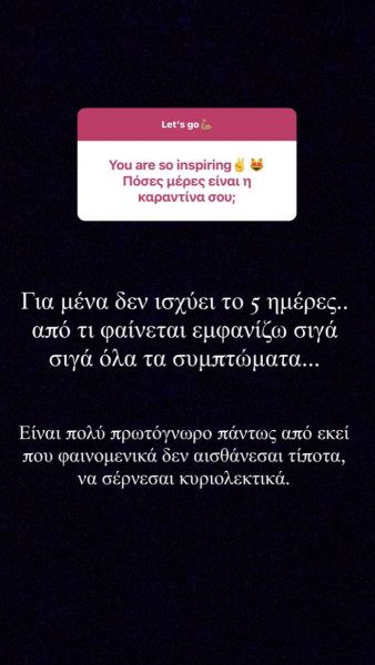 «Για εμένα δεν ισχύει το 5 μέρες. Από ότι φαίνεται, εμφανίζω σιγά-σιγά όλα τα συμπτώματα. Είναι πολύ πρωτόγνωρο πάντως, από εκεί που φαινομενικά δεν αισθάνεσαι τίποτα, να σέρνεσαι κυριολεκτικά».