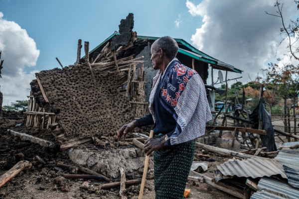 Ένας άνδρας στέκεται μπροστά από το κατεστραμμένο σπίτι του στο χωριό Bisober της Αιθιοπίας. Στην Αιθιοπία και συγκεκριμένα στην περιοχή του Tigray εκτυλίχθηκε μία από τις μεγαλύτερες κρίσεις της χρονιάς, με φαινόμενα ακραίας βίας, εκατοντάδες νεκρούς, καταστροφές σπιτιών και κτιρίων και χιλιάδες εκτοπισμένους. Στις 21 Ιουνίου στην κρίση του Tigray δολοφονήθηκαν βάναυσα και τρία μέλη του προσωπικού μας.