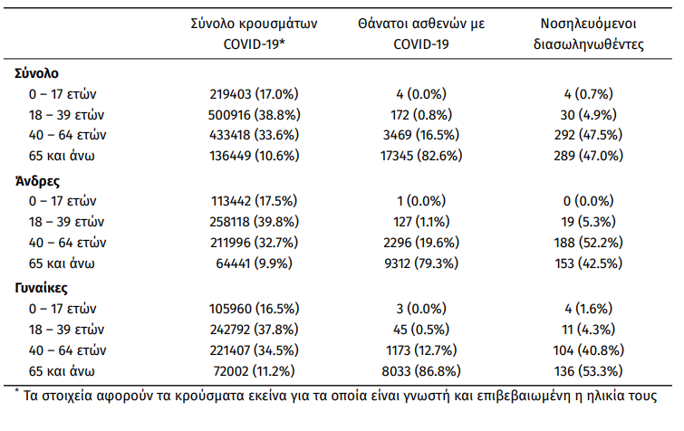 Οι νέοι θάνατοι ασθενών με COVID-19 είναι 78, ενώ από την έναρξη της επιδημίας έχουν καταγραφεί συνολικά 20.990 θάνατοι. Το 95.1% είχε υποκείμενο νόσημα ή/και ηλικία 70 ετών και άνω.
