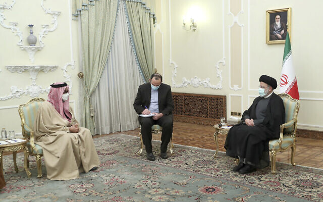 Συνάντηση του πρίγκιπα διαδόχου του Αμπου Ντάμπι σεΐχη Μοχάμεντ μπιν Ζαγιέντ Αλ Ναχιάν (αριστερά) με τον πρόεδρο του Ιράν (δεξιά) Ιμπραήμ Ραΐσι (φωτογραφία Iranian Presidency Office via AP)