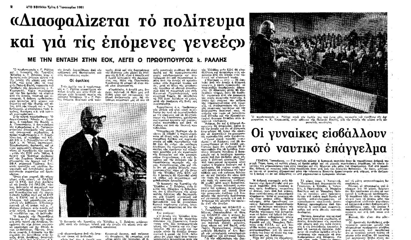 Παρουσία του Προέδρου της Δημοκρατίας κ. Κ. Καραμανλή και με συμμετοχή ολόκληρου του υπουργικού συμβουλίου, ορισμένων από τους ηγέτες της Αντιπολιτεύσεως και άλλων επισήμων, έγινε χθες η επίσημη τελετή για την ένταξη της Ελλάδας στην ΕΟΚ, στην οποία μίλησε ο πρωθυπουργός κ. Γ. Ράλλης και ο διοικητής της Τραπέζης Ελλάδος κ. Ξ. Ζολώτας. Οι δύο ομιλητές αναφέρθηκαν στα «πλεονεκτήματα» και τα «οφέλη», πολιτικά και οικονομικά, και ζήτησαν «περισσότερη και μεθοδικότερη εργασία» για να αξιοποιηθεί η ένταξη. Στην τελετή δεν πήραν μέρος το ΠΑΣΟΚ και το ΚΚΕ, που είναι αντίθετα στην ένταξη, και η ΕΔΗΚ, το ΚΚΕ εσ. και η «Παράταξη Κέντρου», γιατί θεώρησαν την εκδήλωση ως κομματική.