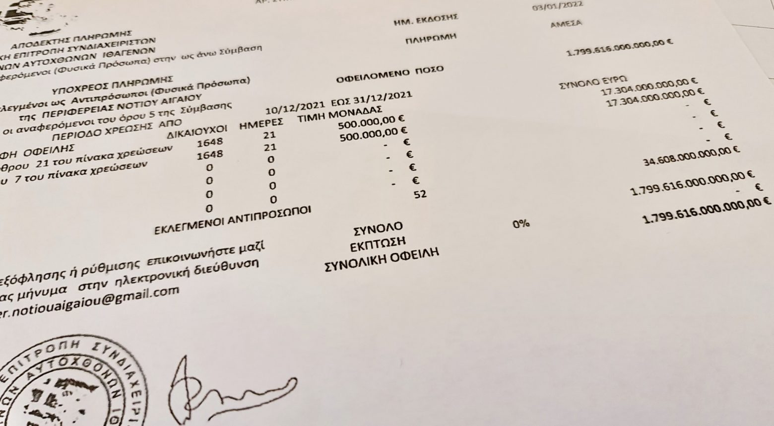 Μάλιστα, έστειλαν πρόστιμο στον Περιφερειάρχη Νοτίου Αιγαίου και ζητώντας να τους πληρώσει το αστρονομικό ποσό του 1 τρις εκατομμυρίου 799 δισεκατομμυρίων 616 εκατομμυρίων ευρώ.