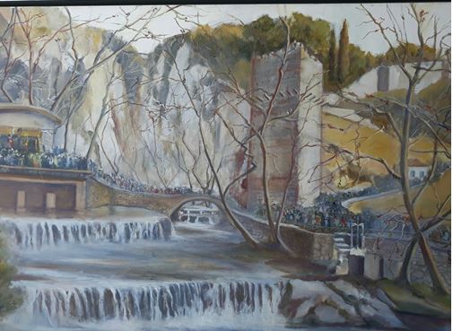 Όμως, στα Θεοφάνεια της Λιβαδειάς άξιζε μια παραπανίσια επιμονή για ν’ απαθανατίσω την υπέροχη κοσμοσυρροή των πιστών κάθε ηλικίας και φύλου στον αρχιερατικό αγιασμό των υδάτων της Έρκυνας. Το βασικό οπτικό συμπλήρωμα του σημερινού μου σημειώματος είναι η ελαιογραφία μου με φόντο τα κατακόρυφα βράχια που σχηματίζουν ένα στενόμακρο φαράγγι. Στο μέσον αυτού του περάσματος τρέχουν αμέτρητοι τόννοι βρόχινου νερού που ενώνονται με τα πηγαία νερά της Έρκυνας και χωρίζονται στην πορεία τους σε μικρούς καταρράκτες ή σε αυλάκια συνδεόμενα με τις φτερωτές, τις πελώριες ρόδες της υδροκίνησης των παλιών εργοστασίων.