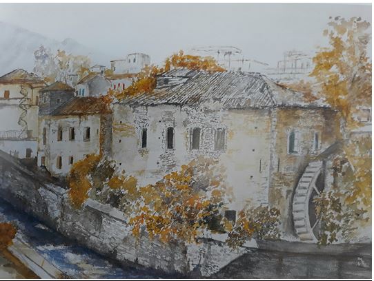 Ένα από τα υδροκίνητα εργοστάσια της Λιβαδειάς που είχε επιλεγεί να λειτουργήσει ως μουσείο υδροκίνησης. Τελικά, λόγω της ασυνεννοησίας και των διχονοιών μεταξύ των υπευθύνων, το εργοστάσιο αυτό κατέρρευσε συμπαρασύροντας και βυθίζοντας στις παρόχθιες λάσπες τον μηχανολογικό του εξοπλισμό. (Ακουαρέλα του Πέτρου Μακρή).