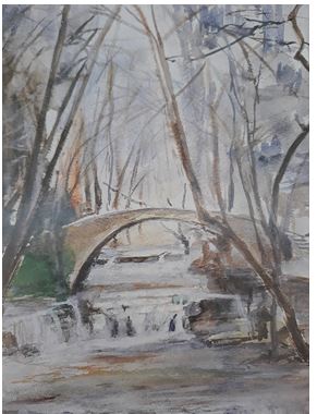 Η διαδρομή από γέφυρα σε γέφυρα επιφυλάσσει και μια νέα έκπληξη. (Ακουαρέλα του Πέτρου Μακρή).