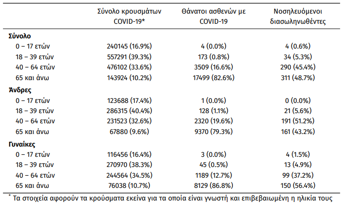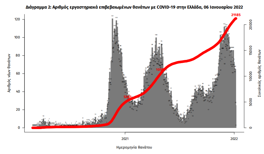 Οι νέοι θάνατοι ασθενών με COVID-19 είναι 70, ενώ από την έναρξη της επιδημίας έχουν καταγραφεί συνολικά 21.185 θάνατοι. Το 95.1% είχε υποκείμενο νόσημα ή/και ηλικία 70 ετών και άνω.