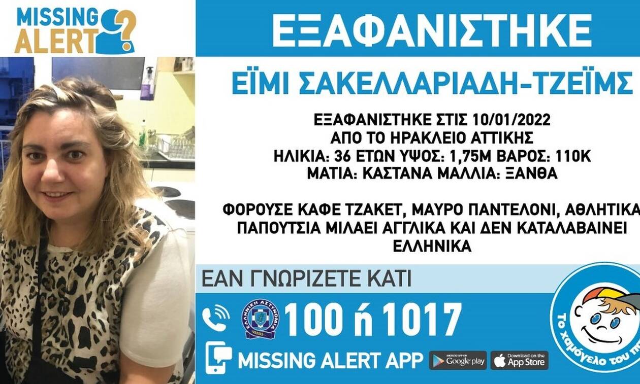 Στις 10/01/2022 και ώρα 12:30, εξαφανίστηκε από την περιοχή του Ηρακλείου Αττικής, η Έιμι Τζέιμς-Σακελλαριάδη, 36 ετών.