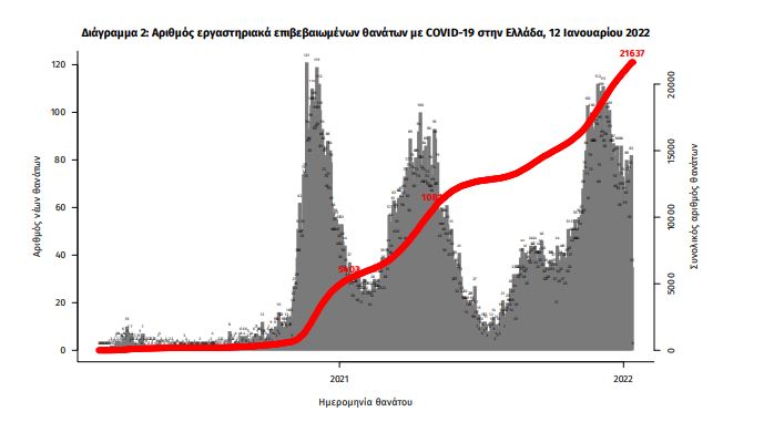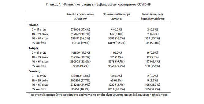 Οι νέοι θάνατοι ασθενών με COVID-19 είναι 77, ενώ από την έναρξη της επιδημίας έχουν καταγραφεί συνολικά 21.637 θάνατοι. Το 95.1% είχε υποκείμενο νόσημα ή/και ηλικία 70 ετών και άνω.