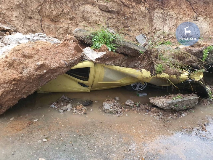 Ο τοίχος όπως φαίνεται στις φωτογραφίες και τα βίντεο τα οποία κατέγραψε η «Ροδιακή», δεν καταπλάκωσε απλώς τα αυτοκίνητα, αλλά τα συνέθλιψε, κάνοντάς τα ένα με το έδαφος.