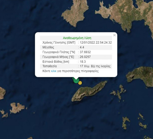 Σεισμική δόνηση 4,4 βαθμών της κλίμακας Ρίχτερ, η οποία χαρακτηρίζεται «ασθενής», καταγράφηκε στις 00:54 στον θαλάσσιο χώρο, 17 χιλιόμετρα βορειοδυτικά της πόλης της Ικαρίας, σύμφωνα με το Γεωδυναμικό Ινστιτούτο του Εθνικού Αστεροσκοπείου Αθηνών.