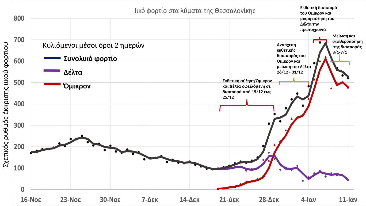 Σε ό,τι αφορά την εξέλιξη του ιικού φορτίου των στελεχών Όμικρον και Δέλτα του SARS-CoV-2, ο αναπληρωτής καθηγητής Μοριακής Μικροβιολογίας του Τμήματος Κτηνιατρικής ΑΠΘ Χρυσόστομος Δόβας εξήγησε: «Διαχρονικά και με βάση τα δεδομένα που έχουμε από το διάστημα που μεσολαβεί μεταξύ σημαντικών γεγονότων διασποράς στην κοινότητα και αύξησης στη συνέχεια του φορτίου στα λύματα της Θεσσαλονίκης, εκτιμούμε ότι για το στέλεχος Όμικρον οι αναλύσεις των λυμάτων υποδηλώνουν το μέγεθος της διασποράς του στην κοινότητα 4-5 ημέρες στο παρελθόν. Οι καταγραφές που έχουμε από 8/1 και μετά καταδεικνύουν σταθεροποίηση του ιικού φορτίου στην κοινότητα σε υψηλά επίπεδα, με το Δέλτα να μειώνεται με αργούς ρυθμούς. Με βάση και τη μέτρηση στις 11/1, το ιικό του φορτίο του Δέλτα στην πόλη έχει μειωθεί στο μισό σε σχέση με τις 19/12 όταν ανιχνεύθηκε το Όμικρον για πρώτη φορά».